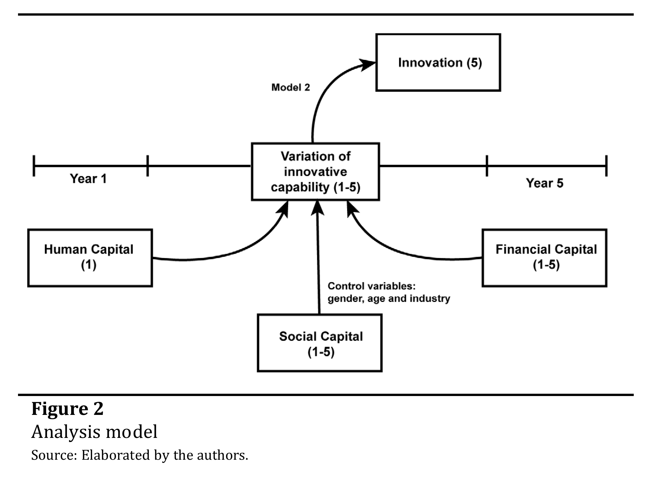 To fulfill the study objectives, two complementary models were created. In the first model, the dependent variable was the variation of innovation capability, measured by the difference between the scores of the fifth and first years. The independent variables were human capital (extracted from the first wave of questionnaires only), accumulated financial capital, and accumulated social capital, both considering all waves. Control variables of gender, age, and industry were incorporated into the model. The second model was composed by innovation as dependent variable, and variation of innovation capability as independent variable. Figure 2 presents the models of analysis.