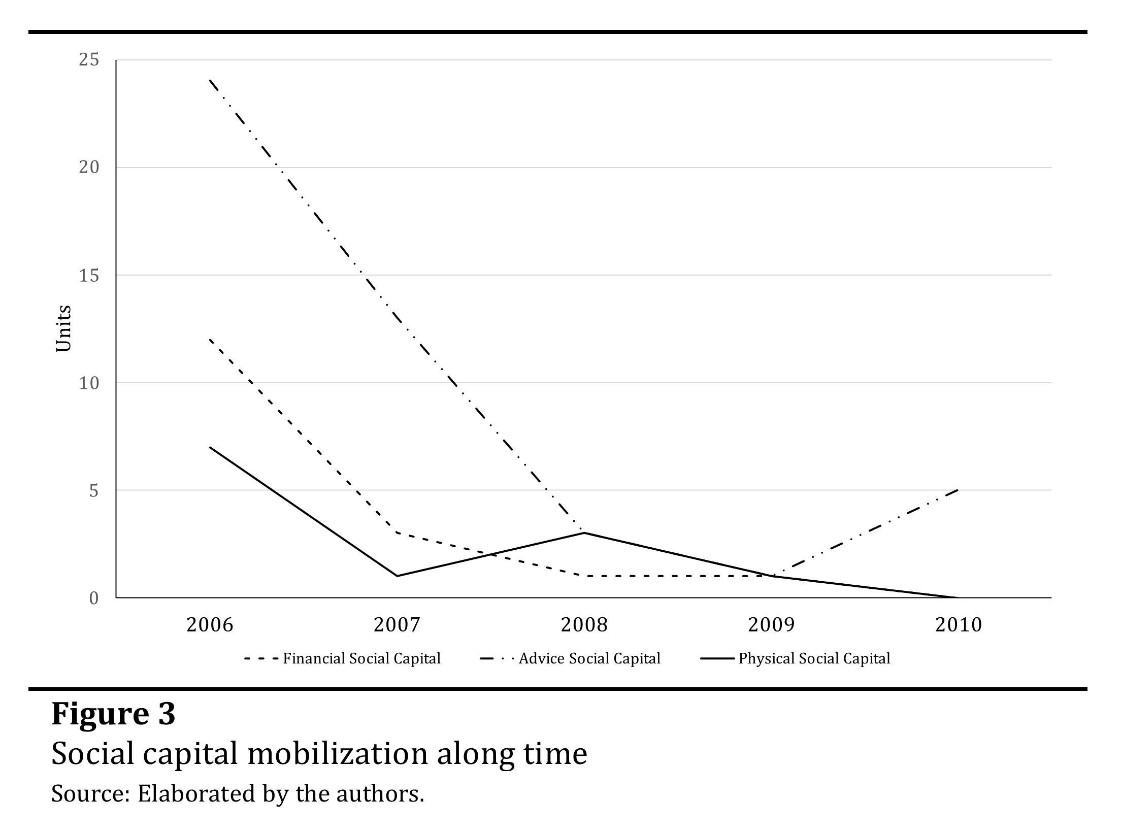 Throughout five years, different agents made a significant contribution to the nascent ventures. Financial, advice and physical resources are some of the supporting categories used. Figure 3 shows the evolution of each type of social capital mobilized over that time horizon.