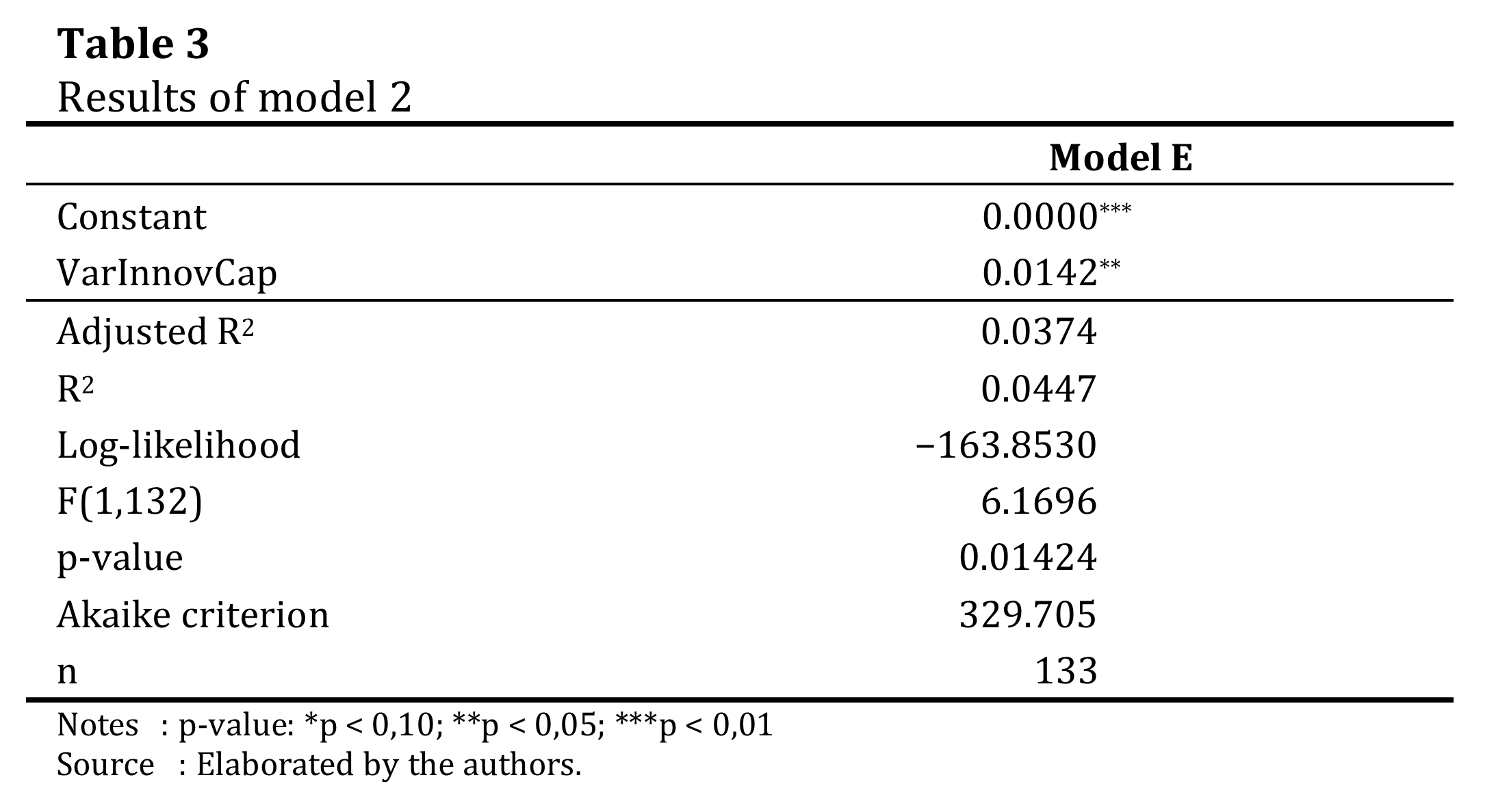 To test model 2, adjusted values of the variation of innovation capability from model 1 were used as independent variable, and innovation in wave E as dependent variable. Like model 1, assumption tests were performed to apply linear regression. Since there is only one predictor variable, there is no need to assess multicollinearity. The normality of errors expressed a tendency for asymmetric distribution. The Breusch-Pagan found absence of heteroscedasticity. The results of this model are shown in Table 3.