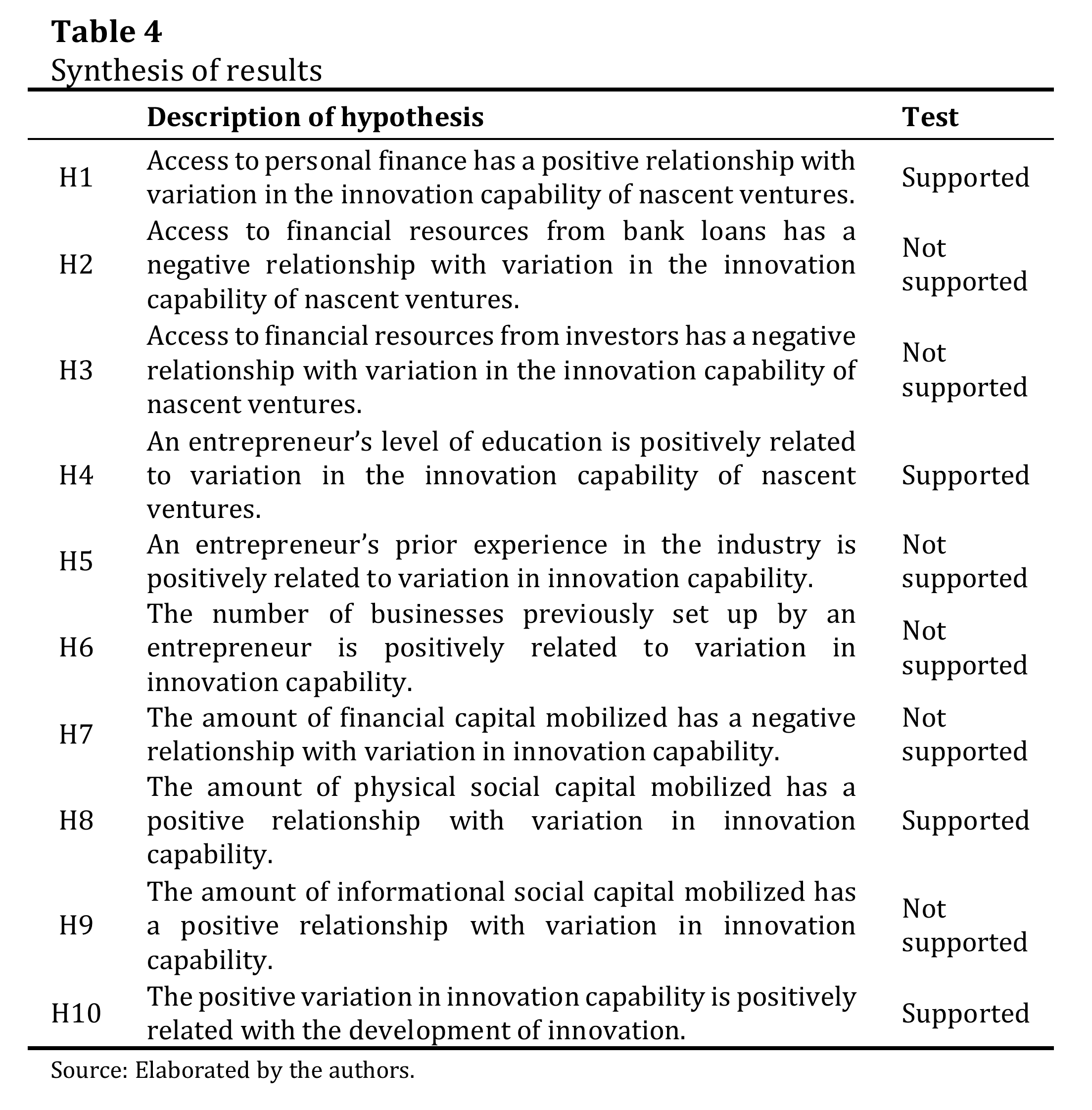 Variation of innovation capability has a significant and positive relationship with innovation (β = 0.0142, p <0.05), which supports hypothesis 10. Table 4 presents a summary of the results found according to the analyses.