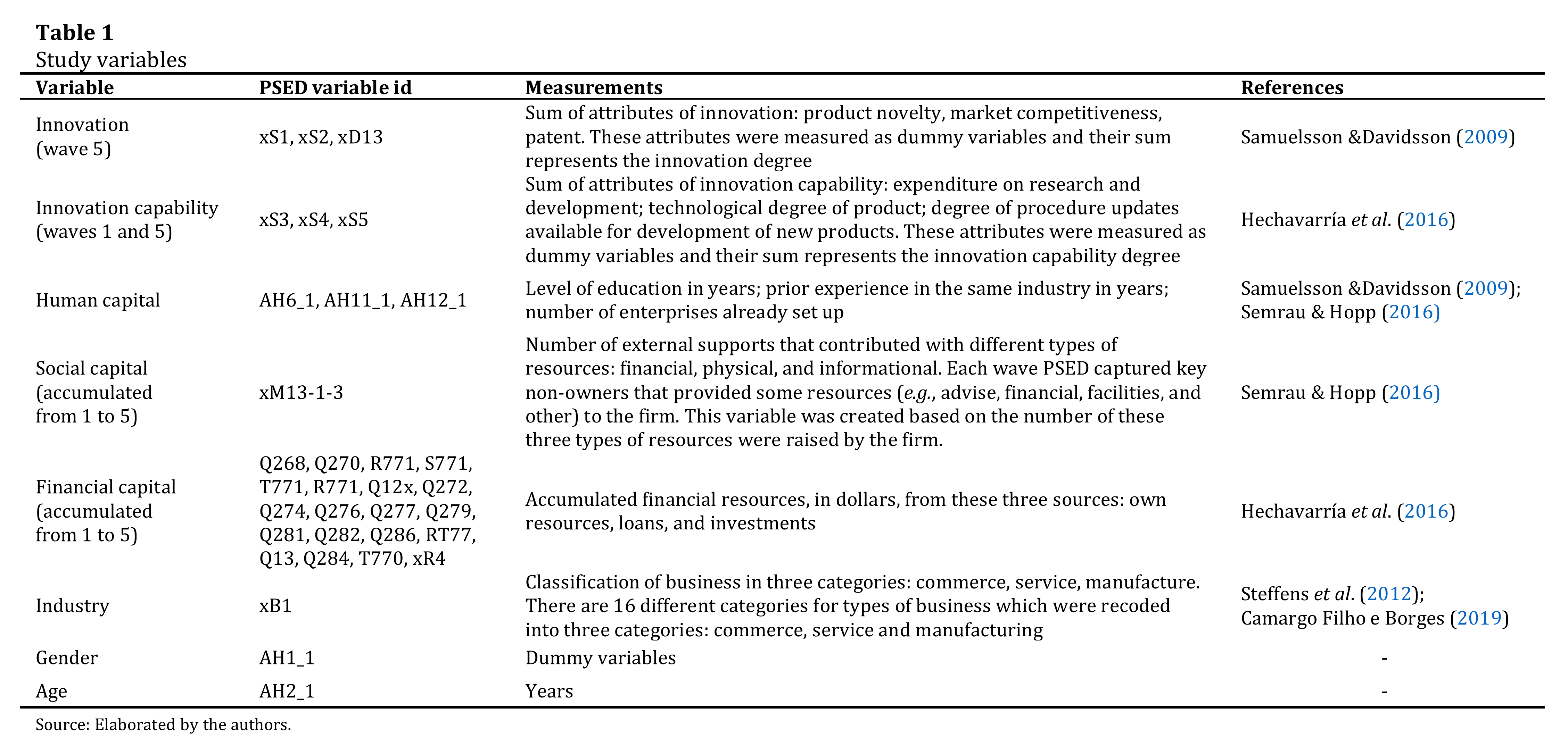 For further research, studies can delve into some variables available on PSED, such as measuring previous experience considering the entrepreneurs’ last job position. We also suggest the future studies include how changes on team composition can affect innovation capability along time. It is also possible to explore the evolution of innovation capability according to milestones from the business emergence process. Further research can also capture contextual elements, such as macroeconomic conditions. This effort could be reached joining PSED with other economic datasets. New studies should include both operating and discontinued businesses to capture how forms of capital influence innovation capability and innovation in both scenarios. The second model (innovation capability and innovation) must be further explored, including other variable that could help explain the effects of this relationship. In case of primary data collection, further research could test the influence of the variables of this study adopting scales that capture all dimensions from innovation capability and other constructs.