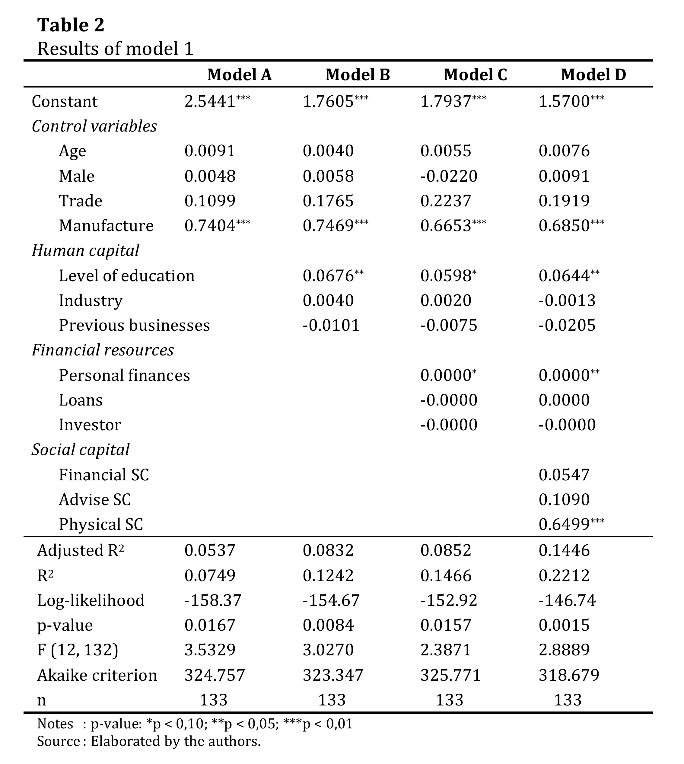 Results from Model 1 (Table 2) show a 0.1446 of adjusted R2. Personal finance had a positive and significant relationship with variation in innovation capability (β = 0.00000487, p < 0.05), which supports Hypothesis 1. The level of education presented a significant and positive relationship (β = 0.0644, p < 0.05), which supports Hypothesis 4. The physical social capital variable had a significant and positive relationship with the dependent variable (β = 0.6499, p < 0.01), which supports Hypothesis 8. Finally, the control variable industry also presented a significant positive result with the variation in innovation capability (β = 0.6850, p < 0.05).