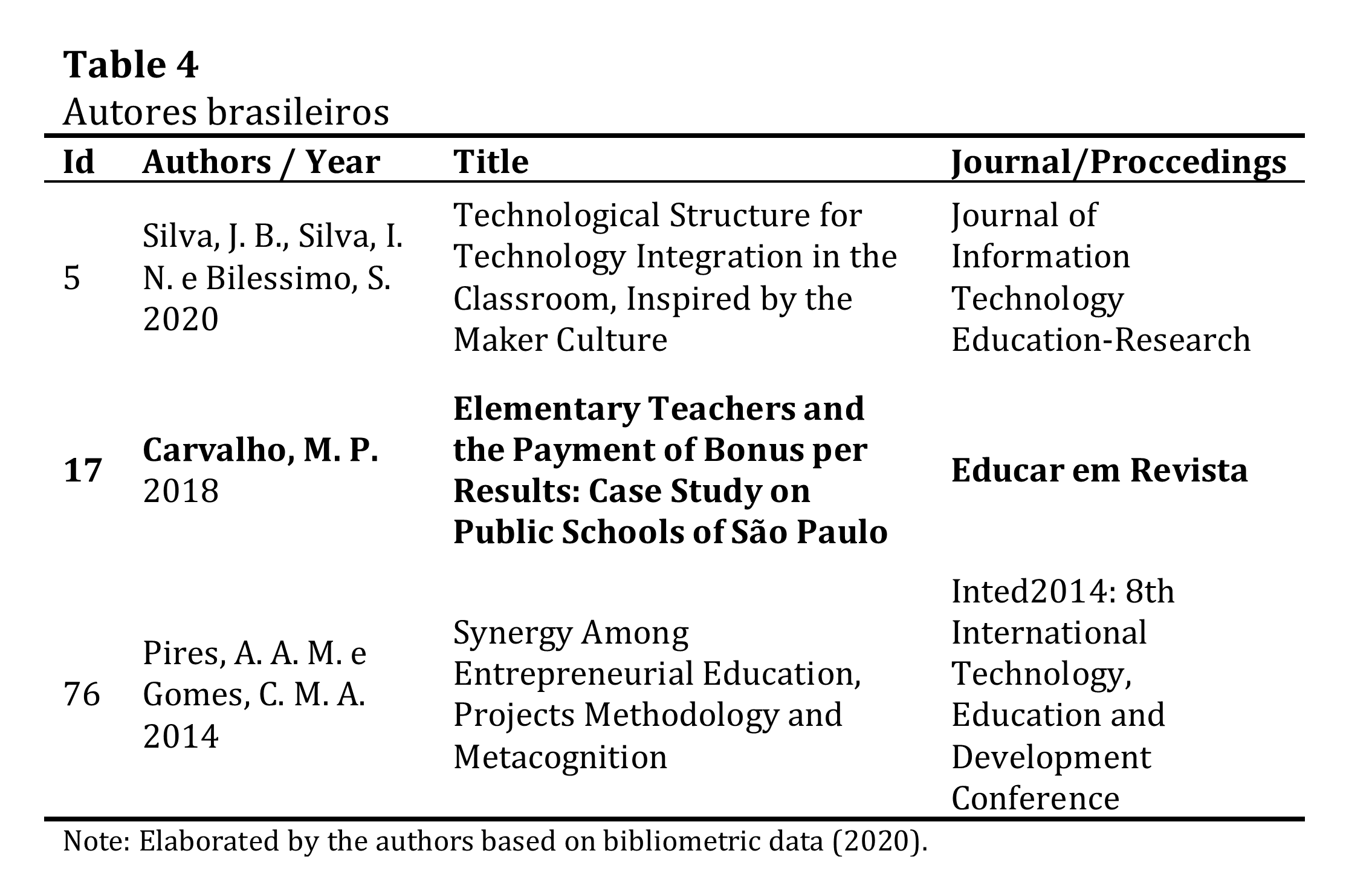 Of the 54 documents that make up the portfolio of this bibliometric analysis (Table 4), three are instituted by Brazilian authors, and of these, only one was published in a Brazilian journal – “Educar em Revista” (highlighted), by Marília Pinto de Carvalho (2018).