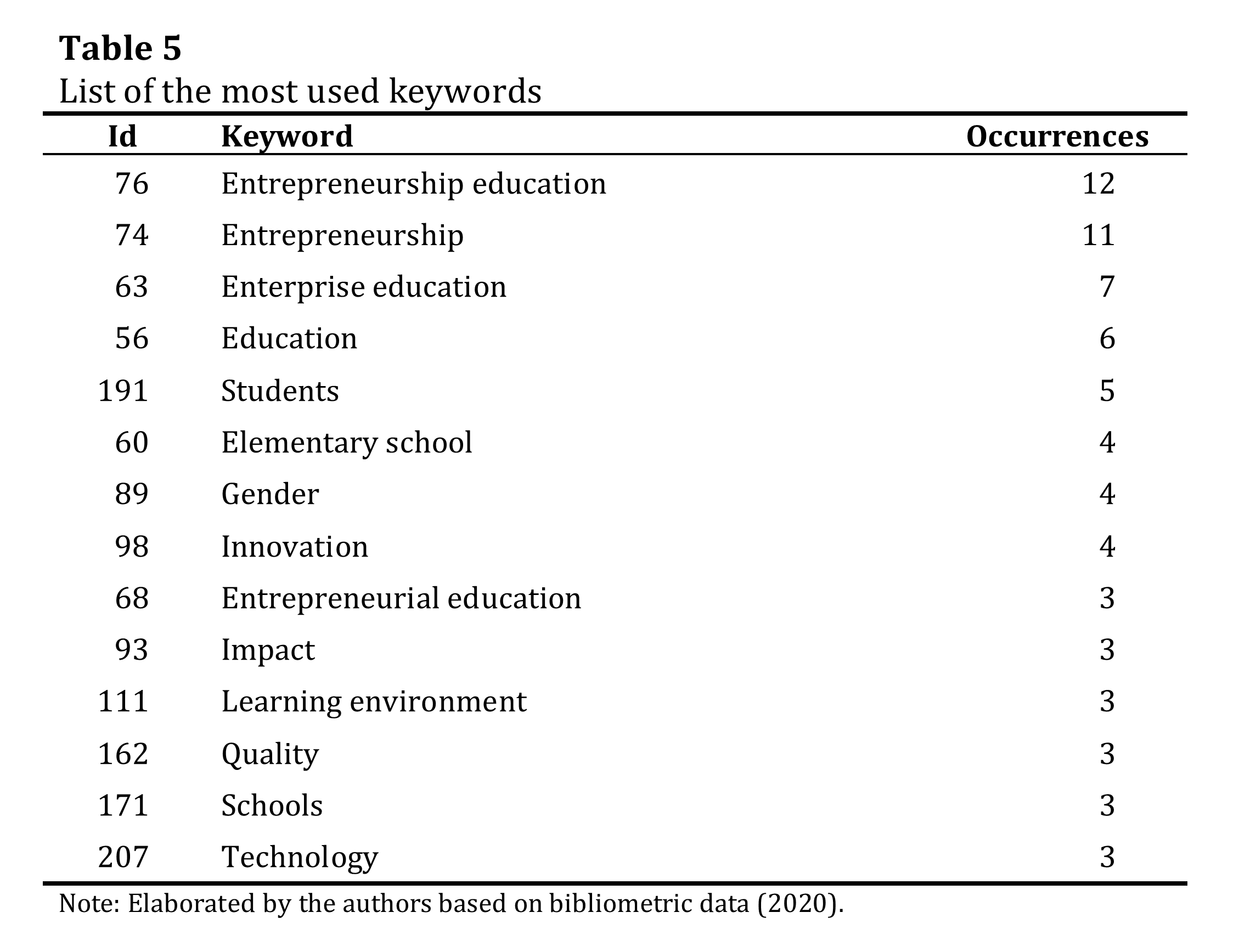225 different keywords were identified, but only those that appeared at least three times in the documents under analysis were selected (Figure 1). Thus, 14 words were classified, with emphasis on “Entrepreneurship education”, in 12 documents; and “Entrepreneurship”, in 11 documents (Table 5).