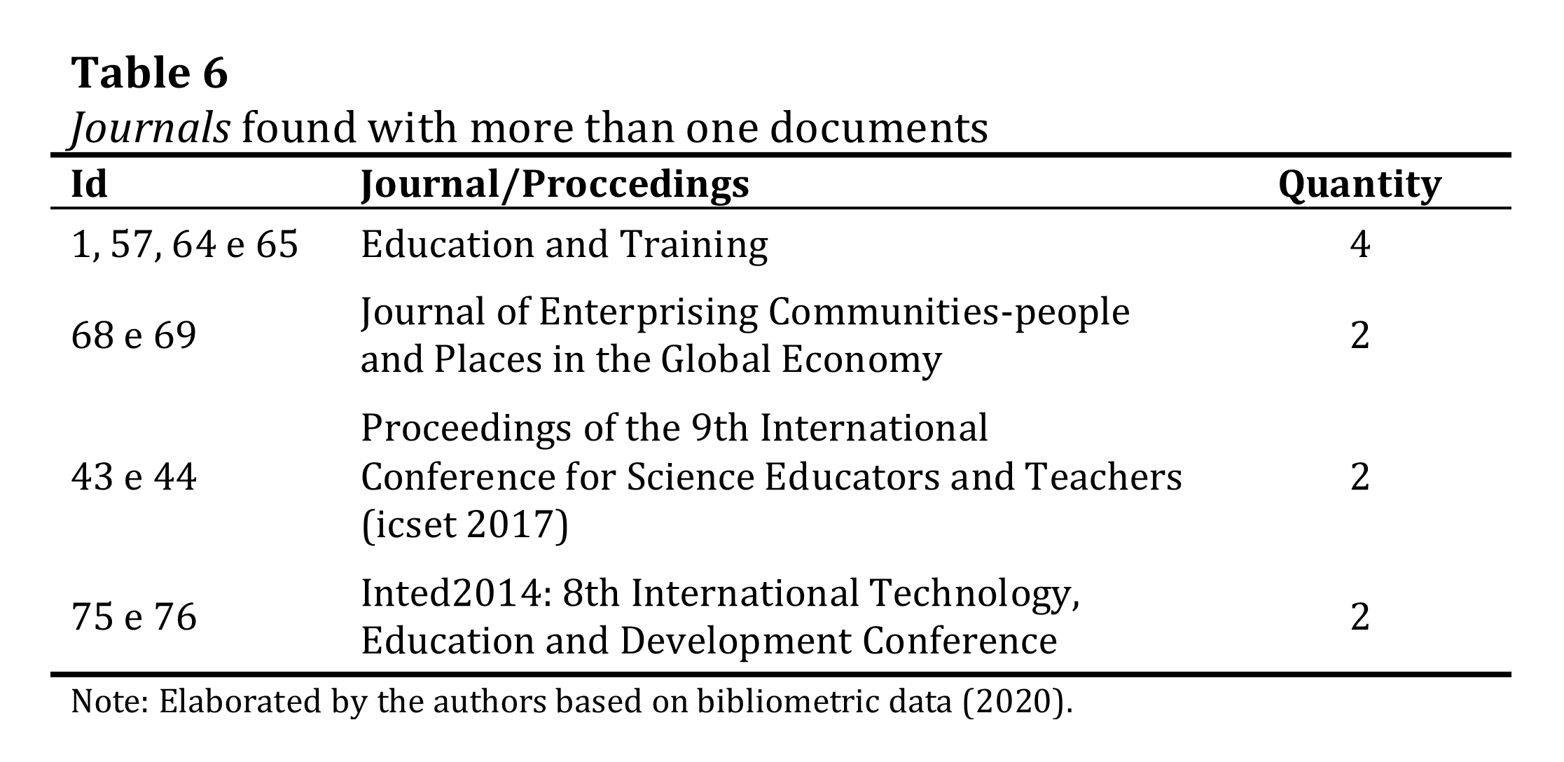 It is noteworthy that a variety of nomenclatures were identified with the same meaning as the object of this study, which included: education for entrepreneurship (Albuquerque et al., 2016) and entrepreneurial learning (Hietanen, 2015). The term “educação empreendedora” was chosen, which often translates the expression “entrepreneurship education”, used worldwide, according to Lackéus (2015).