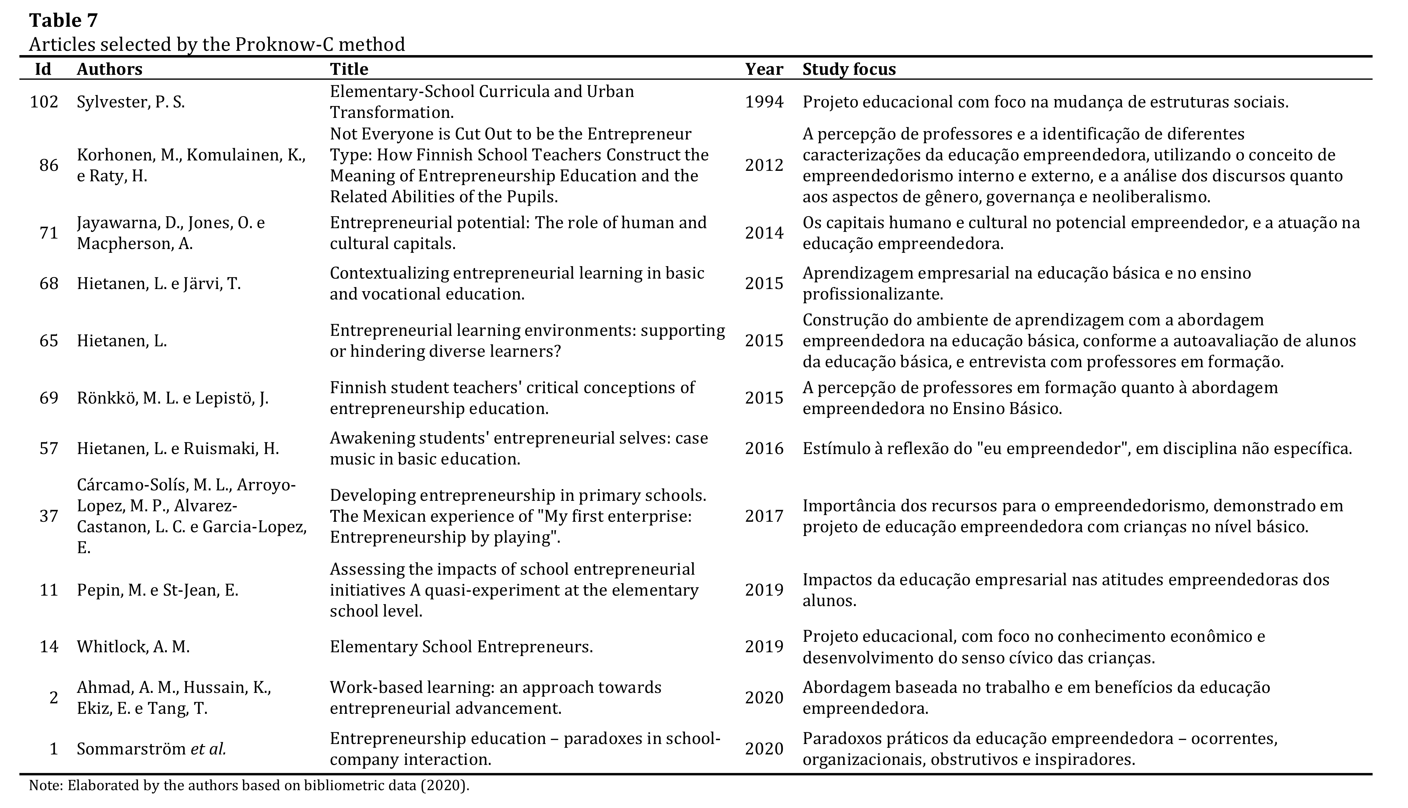 The post-application of the method, as described in the methodology, selected 12 articles considered more relevant (Table 7), which were read and analyzed. They deal with entrepreneurship in Basic Education in various ways, always based on the subject emphasizing student development, in the role of teacher, the school and family members.