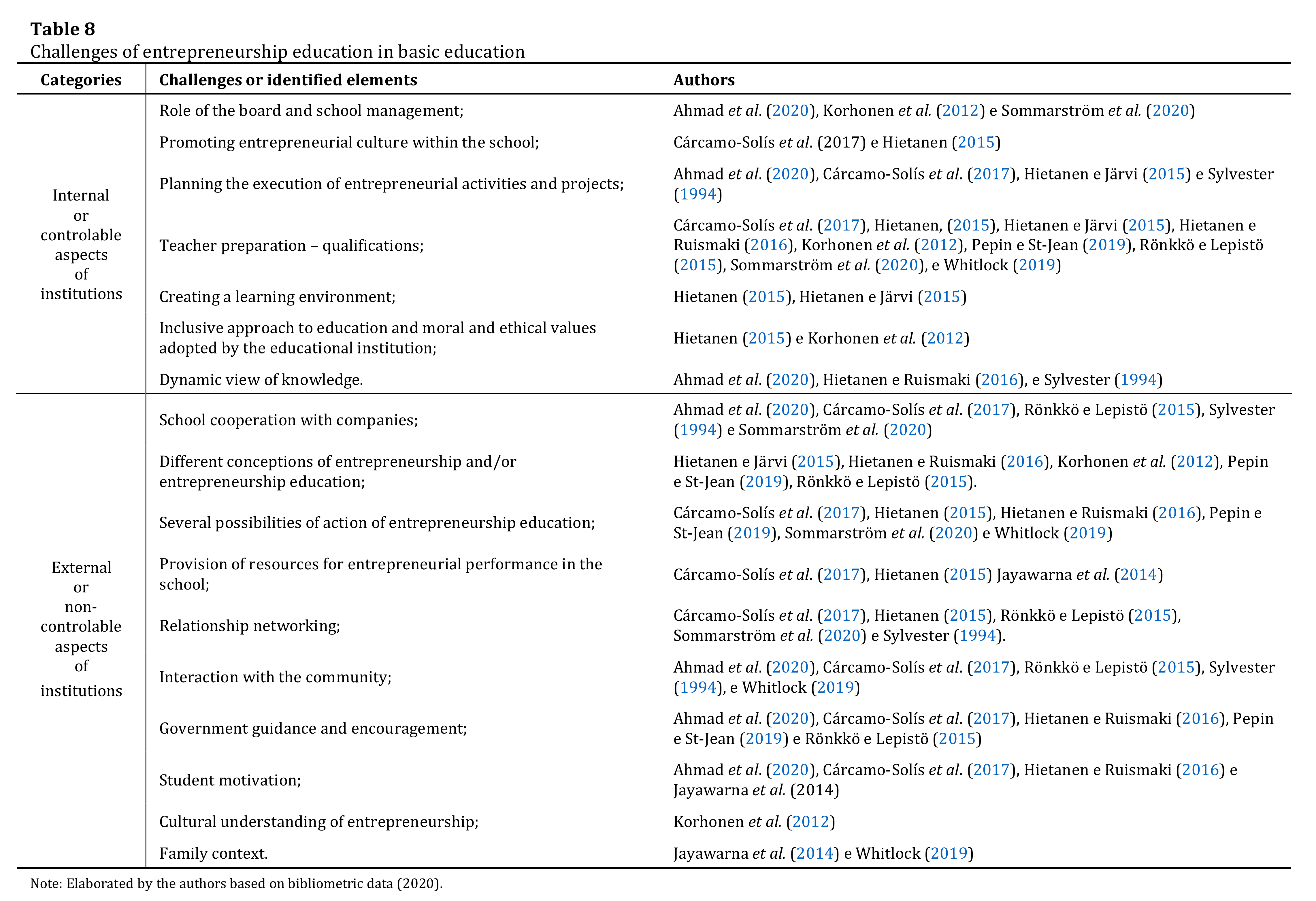The challenges, identified in the reviewed literature, range from the implementation of the entrepreneurship educational approach to its maintenance and development, including controllable and non-controllable aspects by the Basic Education teaching institution. This suggests greater attention to the factors listed above (Table 8), so that institutions can act more efficiently and effectively, if they choose to include entrepreneurship education as one of its educational proposals.