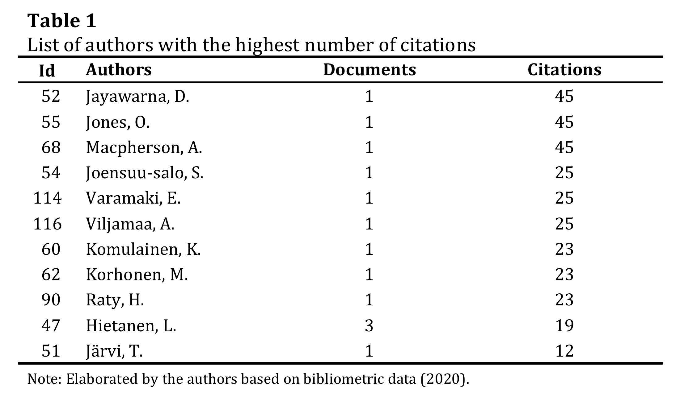 Below (Table 1), the aforementioned group of authors were arranged in descending order, based on the number of citations of their works, the most mentioned being Dilani Jayawarna, Oswald Jones and Allan Macpherson, with 45 citations of only a written document entitled Entrepreneurial potential: The role of human and cultural capitals, published in 2014 in the International Small Business Journal: Researching Entrepreneurship.