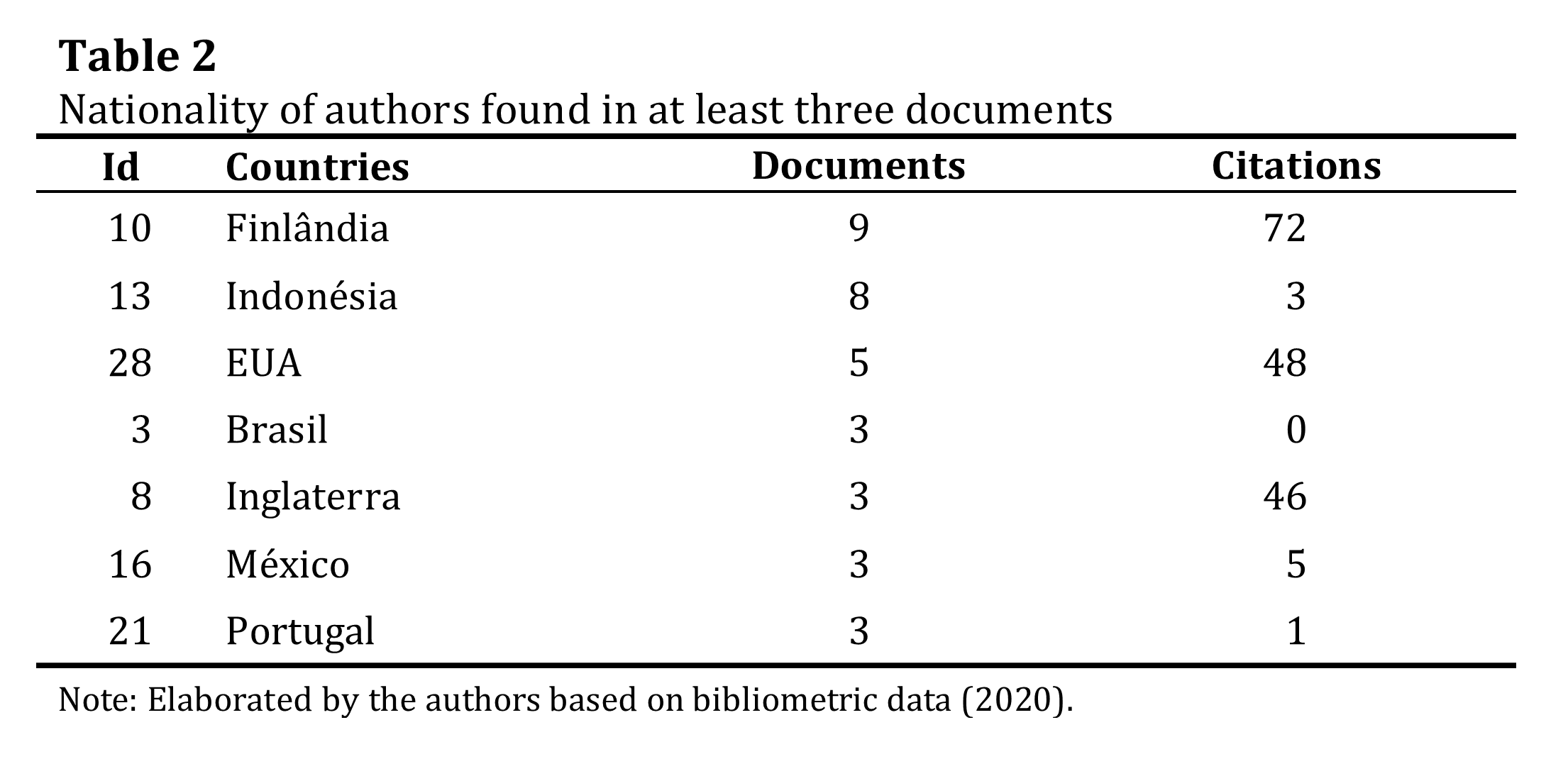 The nationalities of the authors who published on entrepreneurship in Basic Education were also verified in the Web of Science database. Publications in 28 countries were identified: Finland, with nine documents, followed by Indonesia, with eight, and the United States of America (USA), with five. Brazil, England, Mexico and Portugal are in the same position in relation to the number of documents, differing only in the number of citations (Table 2).