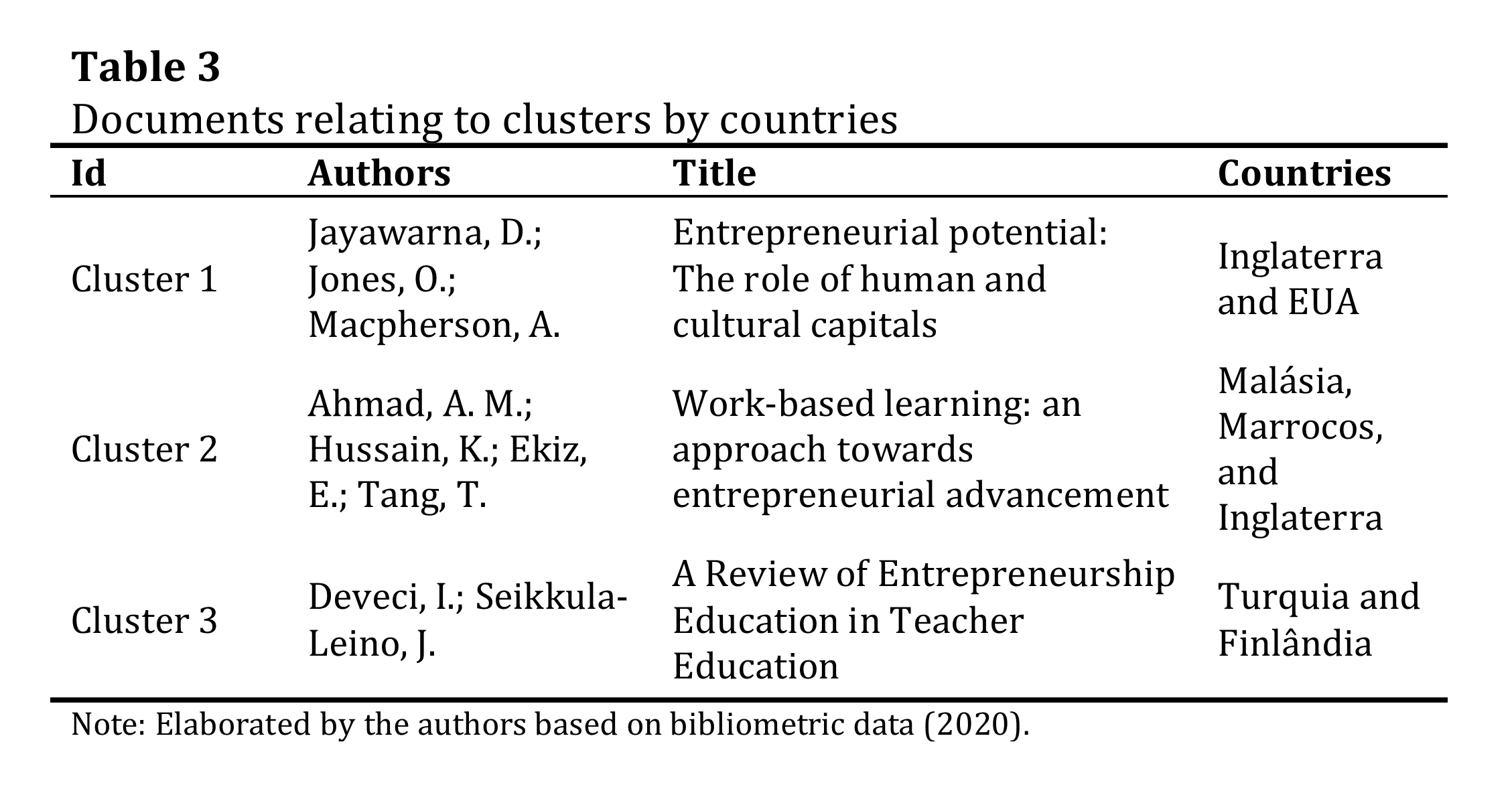 It was also noticed the lack of partnerships between authors from different countries, which constitutes a limiting factor for the development of this field of study, as pointed out by Sommarström et al. (2020). For the implementation of an educational approach such as entrepreneurial education, the search for partnerships represents a continuous effort, an action for the formation of an entrepreneurial culture. This explains the prominence of this variable, as the academy could contribute more effectively if it met the needs of its community, favoring not only social and economic development, but mainly that of individuals.