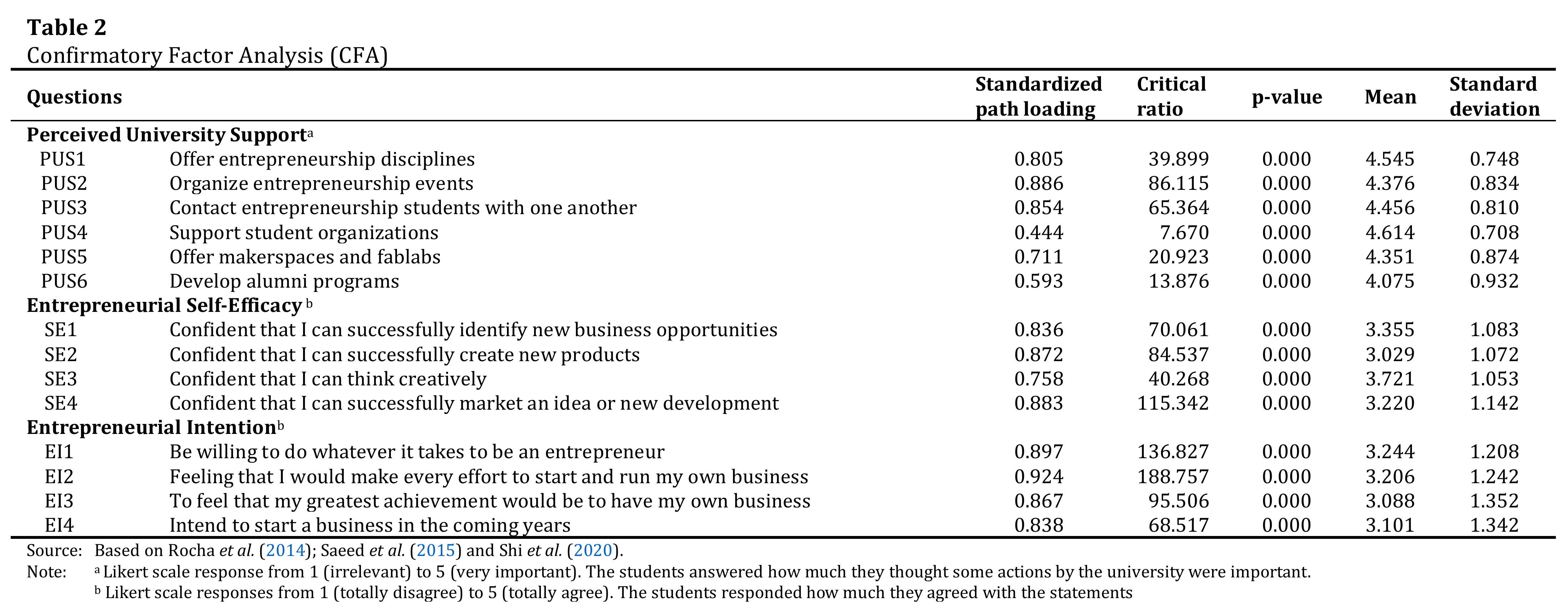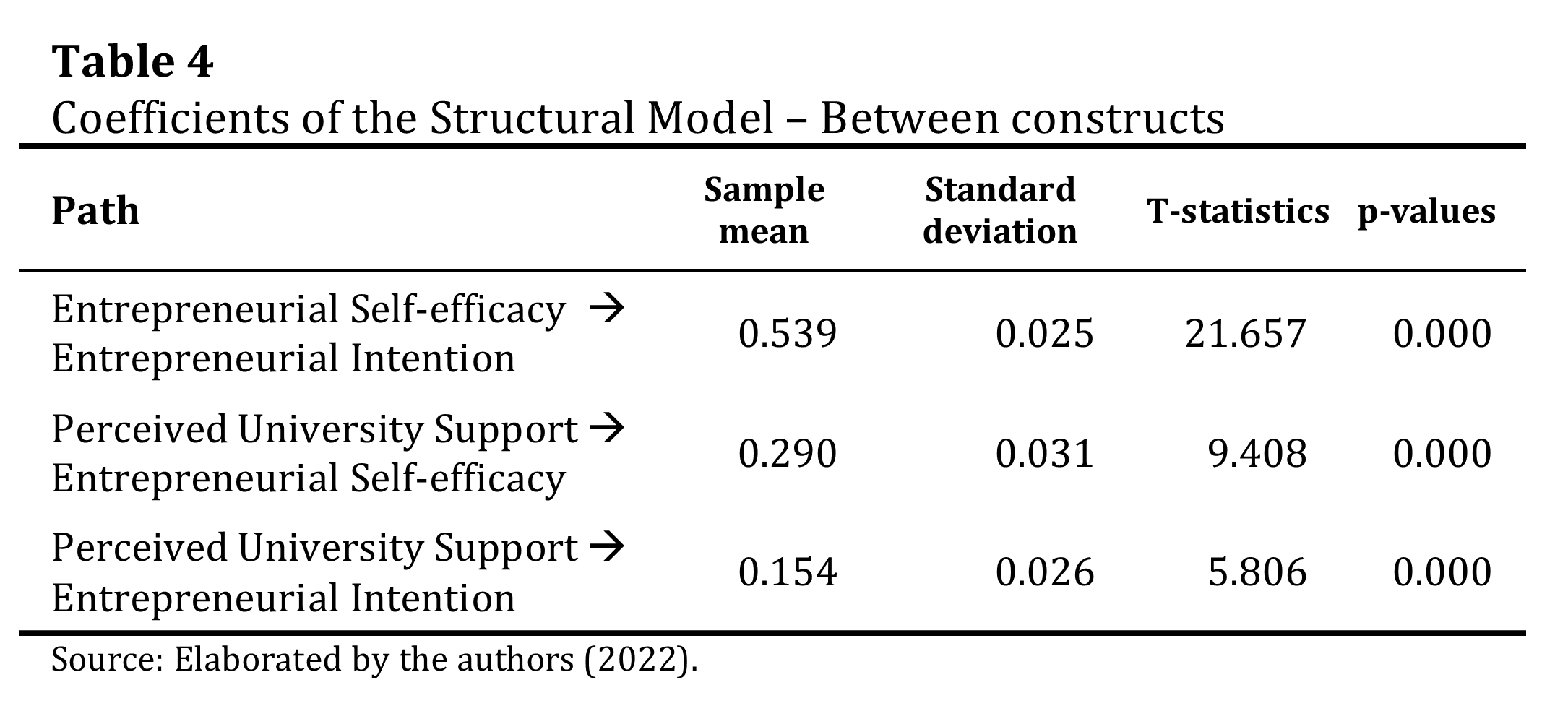 According to the results (Table 4), all relationships are significant at a significance level of 5%, supporting hypotheses 1, 2 and 3. These results are in line with previous studies, which indicate that the perceived university support has a positive influence on entrepreneurial intention and self-efficacy (Saeed et al., 2015; Moraes et al. 2018, 2021; Mustafa et al., 2016), and that self-efficacy has a positive influence on entrepreneurial intention (Moraes et al. , 2021; Saraih et al., 2018).