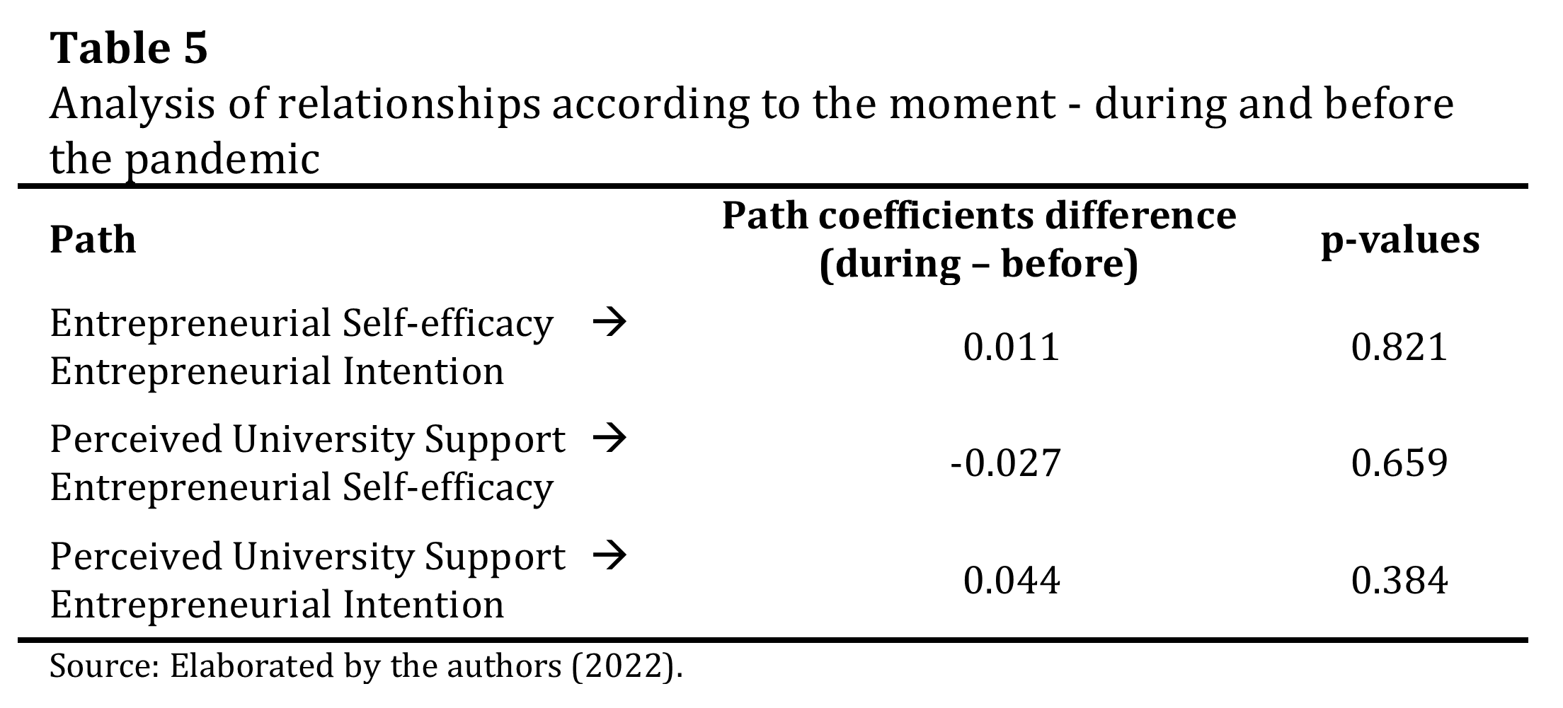 Regarding the unconfirmed hypotheses, although the relationships between perceived university support, entrepreneurial intention and entrepreneurial self-efficacy show differences, these differences were not significant. It is noteworthy that the effect of the pandemic was considered through the students' perceptions of such elements, before and during confinement. The COVID-19 pandemic and the many blockages in economies around the world have created a unique situation that has no documented equivalent in the entrepreneurship literature (Kuckertz et al., 2020). Thus, these results may be linked to the achievement of long-term goals and the tendency to persevere and sustain the effort when faced with difficulties or setbacks in life (Salisu et al., 2020). It aligns with the concept of resilience within the field of entrepreneurship, since it relates to one's preparedness or capacity to adjust, and, it also carries an encouragement of entrepreneurial activity, behaving as a determinant of entrepreneurial intention (Korber & McNaughton, 2018).