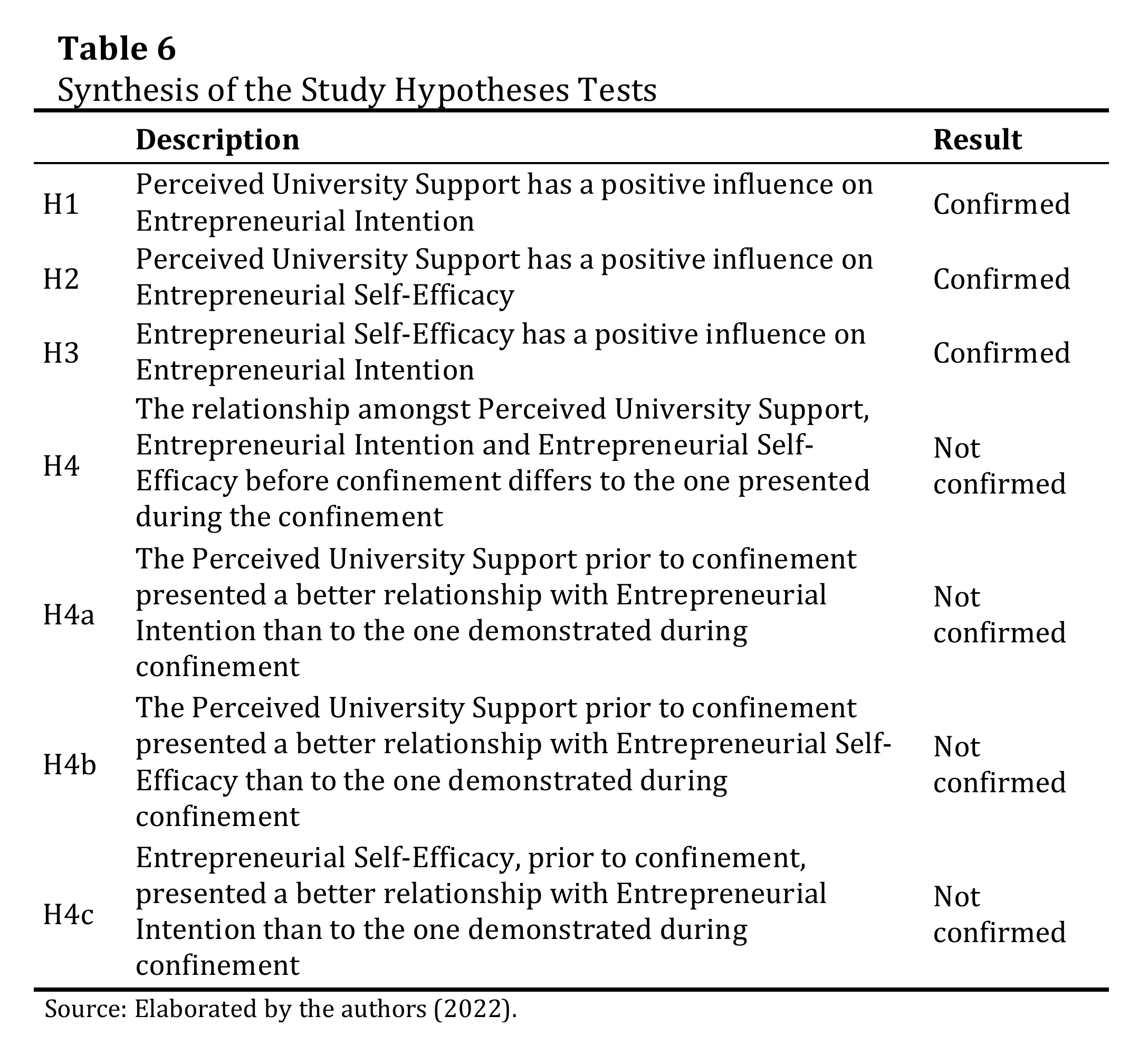 The synthesis of the study hypotheses is shown in Table 6.