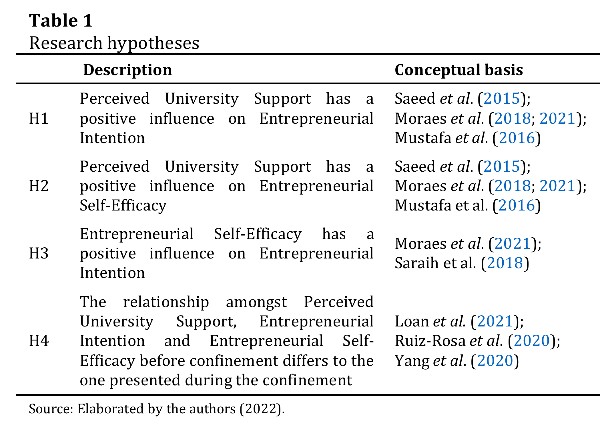 Table 1 presents the research hypotheses and summarizes the main authors used as a conceptual basis.