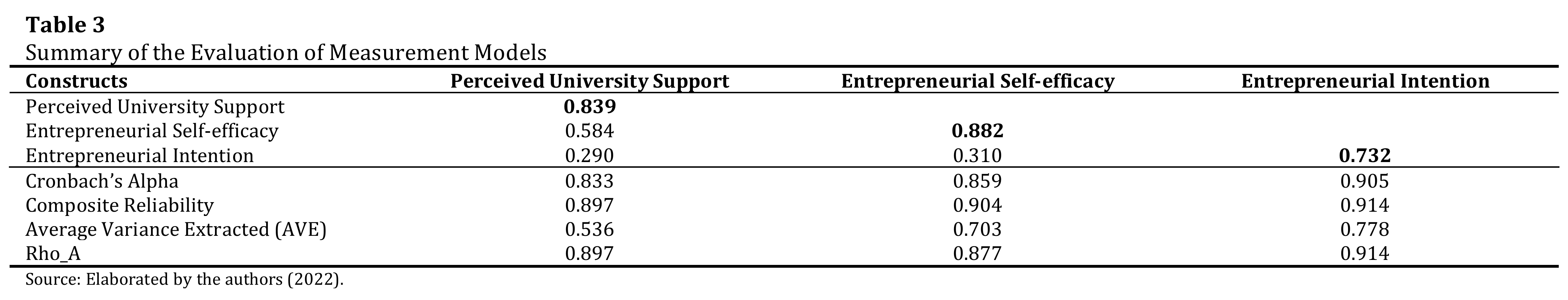 The internal consistency, composite reliability, convergent validity and discriminant validity of the constructs were evaluated with SmartPLS 3 software (Hair et al., 2019). Cronbach's alpha assessed internal consistency. Cronbach's alpha values between 0.70 and 0.90 are considered satisfactory for studies in more advanced stages (Fornell & Larcker, 1981). The composite reliability values should be at least 0.70 to indicate that the items are enough to represent their respective constructs (Hair et al., 2019). The average variance extracted (AVE) is one of the criteria for testing the convergent validity of a construct (Fornell & Larcker, 1981). AVE values higher than 0.50 are acceptable to indicate that a large amount of the mean-variance of the indicators is captured by each factor and not by the measurement error (Hair et al., 2019). All the mentioned values are within these limits (Table 3). The discriminant validity evaluates the distinction between two similar constructs. To confirm the discriminant validity of the model, the square root of AVE that is presented on the diagonal of the correlation matrix (Table 3) should present values higher than the correlation with other constructs (Hair et al., 2019). The square root of AVE values suggests that there is no relationship between the indicators associated with their respective construct with other constructs of the model.