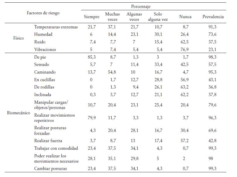 Respecto a los factores de riesgo biomecánicos se encontró que la mayor exposición de ‘siempre’ y ‘muchas veces’ correspondió a permanecer de pie (94 %) y a realizar movimientos repetitivos (91,6 %). La mayor prevalencia fue para trabajar con comodidad (99,3 %), cambiar de postura (99,3 %), trabajar de pie (98,3), poder realizar los movimientos necesarios (98 %), realizar movimientos repetitivos (96,3) y trabajar caminando (95,3 %) (tabla 1).