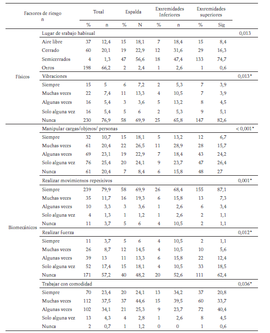 Con relación al lugar de trabajo, el ambiente semicerrado se asoció con el segmento superior y espalda más que para el inferior; el ambiente cerrado estuvo asociado con las extremidades inferiores (p = 0,013) más que para espalda y las superiores.