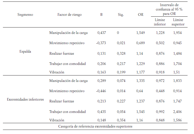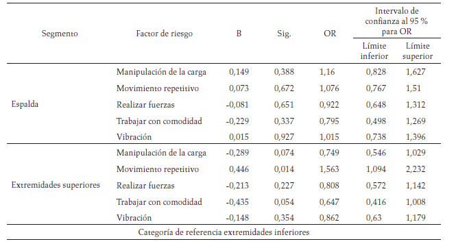 Los factores asociados significativamente en conjunto al DME de espalda comparado con miembros superiores fueron: la mayor frecuencia de exposición para la manipulación de cargas y la menor frecuencia de exposición del movimiento repetitivo. Al comparar las extremidades inferiores con las superiores se encontró mayor asociación con el movimiento repetitivo y cerca de ser significativo el trabajar con comodidad y la manipulación de cargas (tabla 4).