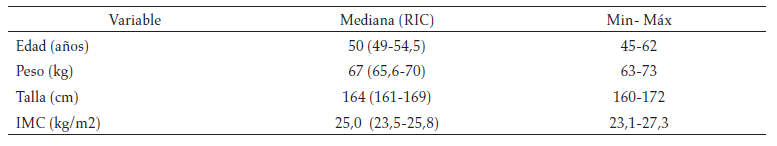El total de población elegible que inició el estudio mediante convocatoria fue de 12 mujeres que cumplían con los criterios de inclusión, de las cuales 4 fueron excluidas por inasistencia (2), cruce de horarios (1) y enfermedad que causó incapacidad temporal (1); al final de la intervención fueron analizadas 8 participantes. Las características generales de la población se describen en la tabla 1. La mediana de edad fue de 50 años (RIC 49-54,5 años), la mediana del peso fue 67 kg (RIC 65,6-70 kg), la mediana de talla 1,64 m (RIC 161-169) y la mediana del IMC fue 25,0 kg/m2 (RIC 23,5-25,8).
