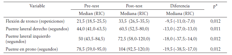En la tabla 2 se presentan los resultados de las pruebas que evalúan la fuerza de la musculatura core. Se encontró aumento estadísticamente significativo antes y después de la intervención en el número de repeticiones de la prueba flexión de tronco (p = 0,012) y el tiempo en realizar las pruebas puente lateral derecho (p = 0,011) e izquierdo (p = 0,012) y puente en prono (p = 0,012). Según el cuestionario SF-MPQ (tabla 3), hubo disminución en el puntaje sensorial (p = 0,017), puntaje afectivo (p = 0,020), intensidad del dolor global (p = 0,025) e intensidad del dolor presente (p = 0,030) después de la intervención. En relación con el impacto de la fibromialgia, medido con el S-FIQ se evidenció disminución significativa en la ausencia laboral (p = 0,029), el trabajo (p = 0,017), el cansancio matutino (p = 0,012), la rigidez (p = 0,017) y la ansiedad (p = 0,025), así como el puntaje total del S-FIQ (p = 0,012) (tabla 4). Según el IPAQ, aumentó el índice metabolico denominado Met/minuto-semana (p = 0,036) de práctica de actividad física después de la intervención, estos resultados se realizan con datos truncados (tabla 5).