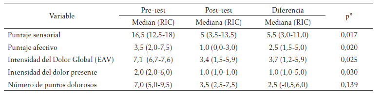 Existe evidencia de que el entrenamiento de fuerza logra el control del dolor, como lo demostró Häkkinen entrenando 21 semanas, dos veces por semana con sesiones de 60 minutos, realizando ejercicios con una dosis de 2 a 6 series y 5 a 12 repeticiones con cargas entre el 40 % y el 80 % de 1Rmax. Reportó mejoras en la fuerza muscular, estado de ánimo, dolor del cuello y fatiga, aunque no hubo cambios en el dolor general o el número de puntos dolorosos (30); por su parte, Jones entrenando 12 semanas, dos veces por semana con sesiones de 60 minutos, realizando ejercicios con una dosis de 1 a 5 series y 12 repeticiones con cargas bajas, mostró disminución del número de puntos dolorosos, así como la intensidad del dolor en general medido por EAV (29); adicionalmente, Kingsley entrenando 12 semanas, dos veces por semana con sesiones de 30 minutos, realizando ejercicios con una dosis de 1 serie de 8 a 12 repeticiones con cargas entre el 40 % y el 80 % de 1Rmax, reportó disminución del número de puntos dolorosos e intensidad del dolor generalizado (61). Estas dosis en la prescripción del EF, son similares a las propuestas en este estudio donde también se obtiene efectos (pre vs. postest) sobre la modulación del puntaje sensorial con mediana de 5,5 (p = 0,017), puntaje afectivo mediana 2,5 (p = 0,02), intensidad del dolor global según la EAV con mediana de 3,7 (p = 0,02), intensidad del dolor presente 1,0 (p = 0,03) y disminución del número de puntos dolorosos 2,5 (p = 0,13), sin embargo, esta última no es significativa.