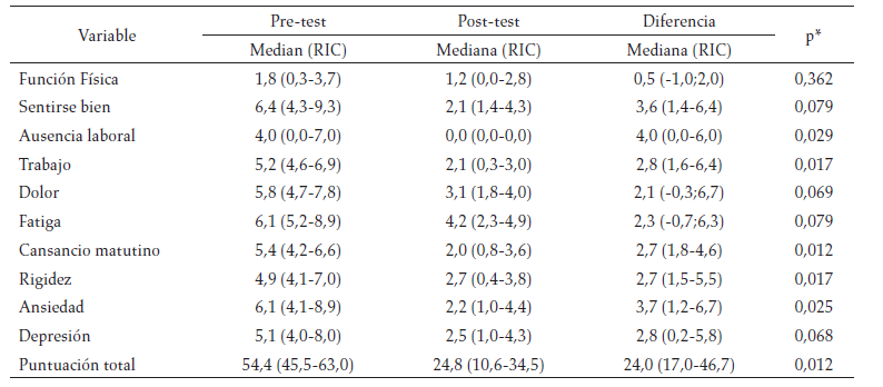 Otro aspecto evaluado fue la CVRS, que mostró cambios positivos en todas las mediciones (pre vs. postest), sobresaliendo de estas el cansancio matutino con mediana 2,7 (p = 0,012), la rigidez con mediana de 2,7 (p = 0,017) y la ausencia laboral con mediana de 4,0 (p = 0,029). Datos similares fueron reportados por Romero, aplicando 28 semanas de entrenamiento, encontrando mejoría en la puntuación total del FIQ (p < 0,001), en la rigidez (p = 0,005), el dolor, la fatiga, el cansancio por la mañana, la ansiedad y la depresión (todos p < 0,001). La intervención también fue efectiva en la vitalidad (p = 0,018), función física, rol físico, salud general y salud mental (p < 0,001), concluyendo en las mejorías del dolor, la capacidad funcional, la sintomatología y los resultados psicológicos en las mujeres con FM (68).