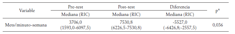 En el análisis estadístico se calcularon medidas de tendencia central (mediana) y de dispersión (RIC: rango intercuartílico) para las variables cuantitativas y frecuencias absolutas y relativas para las variables cualitativas. El efecto del programa de EF se evaluó comparando los cambios pretest y postest en las variables de respuesta mediante el Test de Wilcoxon para muestras pareadas. El nivel de significancia fue de 0,05. El software estadístico que se usó fue Stata 11.0.