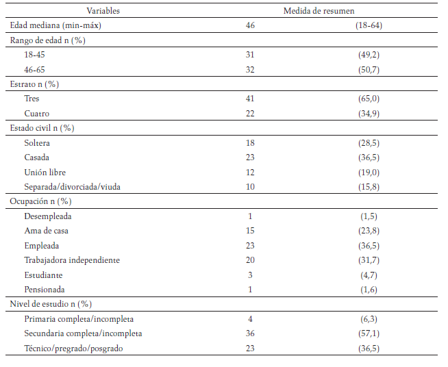 La muestra quedó conformada por 63 mujeres con exceso de peso, de las cuales el 76,1 % presentaba sobrepeso y el 23,8 % obesidad. La mediana de edad fue de 46 años; con edad mínima de 18 y la máxima de 64 años, la mayoría de estrato socioeconómico tres (65 %). En cuanto al estado civil, el 36,5 % estaban casadas, y el 28,5 % solteras y se desempeñaban principalmente como empleadas (36,5 %) o como trabajadoras independientes (31,7 %), la mayoría realizó estudios secundarios (57,1 %) (tabla1).