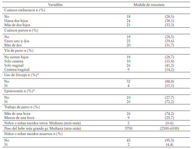 En relación con los antecedentes ginecobstétricos, el 39,6 % había tenido entre uno y dos hijos, el 41,2 % tuvo parto vaginal, predominando el tiempo de trabajo de parto de más de una hora (74,2 %) (tabla 2).