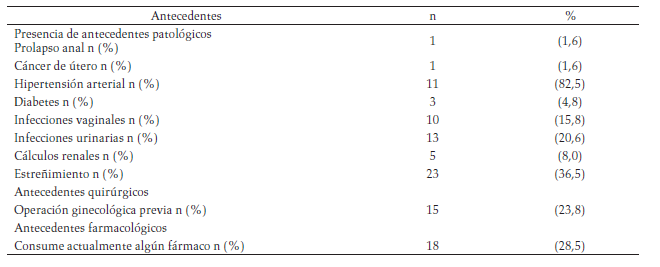 De los antecedentes patológicos, se destacaron el estreñimiento (36,5 %), las infecciones urinarias (20,6 %) y las infecciones vaginales (15,8 %). En antecedentes quirúrgicos, el 23,8 % de la población presentó una operación ginecológica previa y en antecedentes farmacológicos, el 28 % consumía algún fármaco (tabla 3).
