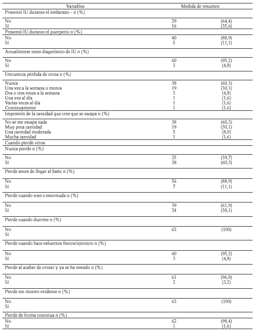 Al indagar sobre los antecedentes de la IU, el 35,5 % la presentó durante el embarazo, el 11,1 % durante el puerperio y el 4,8 % manifestó tenerla diagnosticada. Los resultados del ICIQ-SF se presentan en la tabla 4. El 30,1 % presentó síntomas de goteo una vez a la semana o menos y el 4,8 % dos o tres veces por semana. En relación con la cantidad, el 30,1 % refirió muy poco goteo y se daba principalmente al toser o estornudar con un 38,1 %. Según los tipos de IU, el 28,6 % presentó IU de esfuerzo, el 11,1 % IU mixta, ninguna participante presentó IU de urgencia y el 39,7 % (n = 25) presentó IU de cualquier tipo (tabla 4).