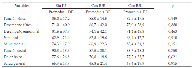 Se comparó el puntaje de CVRS según tipo de IU mediante un análisis de varianza de una vía. Para todo el análisis se utilizó un nivel alpha = 0,05. El poder para encontrar diferencias en CVRS entre los grupos sin IU, IUE y IUU fue de 0,05 en función física, desempeño físico y vitalidad; 0,14 en desempeño emocional; 0,39 en salud mental; 0,18 en función social; 0,12 en dolor físico y 0,08 en salud general.