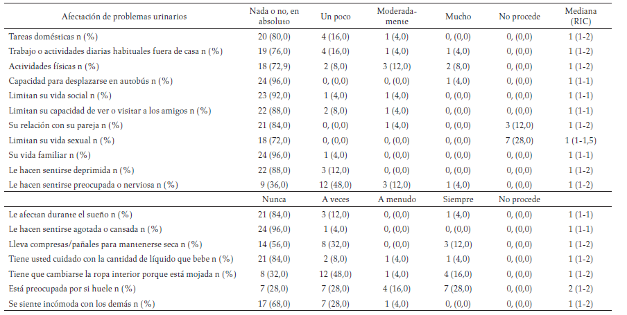 En la población de mujeres con IU (n = 25), en la puntuación del cuestionario ICIQ-LUSTqol, se obtuvo una mediana de 27 con un mínimo de 20 y un máximo de 52. Las respuestas de las participantes por pregunta se presentan en la tabla 6. Se resalta que en la pregunta “le hacen sentirse preocupada o nerviosa”, el 48 %, 12 % y 4 % respondió un poco, moderadamente o mucho, respectivamente. En la pregunta “tiene que cambiarse la ropa interior porque está mojada”, el 48 %, 4 % y 16 % respondió a veces, a menudo y siempre, respectivamente. Mientras que, en la pregunta “está preocupada por si huele”, un 28 % respondió a veces, ese mismo porcentaje respondió siempre y el 16 % a menudo (tabla 6).