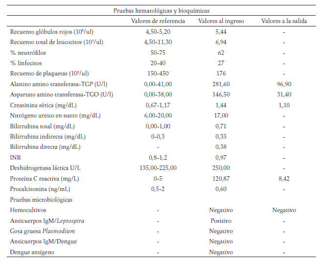 El paciente reingresa el 9 de noviembre de 2013 con la misma sintomatología y se realizan nuevas pruebas hematológicas y bioquímicas. Los resultados evidencian compromiso de la función renal y hepática (tabla 1). Los signos vitales del paciente son normales a excepción de la temperatura (39 ºC). Examen neurológico sin alteraciones. La radiografía de tórax y la ecografía de abdomen total no revelan ninguna anormalidad. El paciente refiere exposición a agua fresca en su último viaje y asegura nadar en ríos sin protección ocular. Al examen físico se encontraron heridas abiertas en miembros superiores e inferiores, debidas a la práctica de deporte extremo (torrentismo) en un río del departamento de Santander, lo que reafirma la sospecha epidemiológica de enfermedad tropical y al considerar que el lugar de procedencia es endémico para leptospirosis se solicitaron reactantes de fase aguda (PCR y procalcitonina) y anticuerpos tipo IgM contra Leptospira por método de inmunocromatografía con resultados positivos. Se tomaron muestras para hemocultivo, con informe negativo a los siete días de incubación.