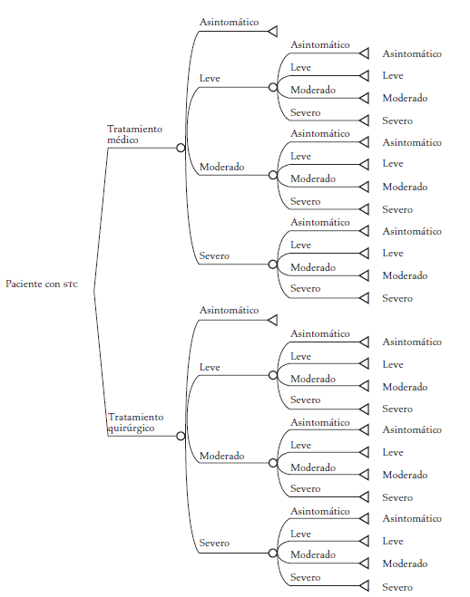 Existe una amplia variedad de tratamientos médicos y quirúrgicos para el manejo de dicha patología. La decisión de someter al paciente a estas intervenciones, especialmente al tratamiento quirúrgico, contrasta con la historia natural de esta enfermedad que muestra una tendencia a la mejoría o estabilización de síntomas en el mediano y largo plazo con empeoramiento en solo el 21 % de los pacientes (15, 16, 17, 18). Infortunadamente, no existen estudios en el medio que hayan evaluado la eficiencia de estas intervenciones y que guíen al tomador de decisión sobre cual alternativa elegir.