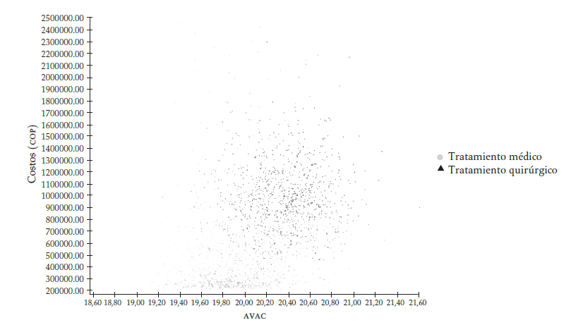En conclusión, el tratamiento médico es una alternativa de costo útil, desde la perspectiva social a los 6 meses en la muestra estudiada. Sin embargo, en el largo plazo existe mayor probabilidad de que la cirugía sea de costo útil, especialmente si se tiene una disposición a pagar de COP 5 000 000 por AVAC adicional, en un plazo de 20 años.