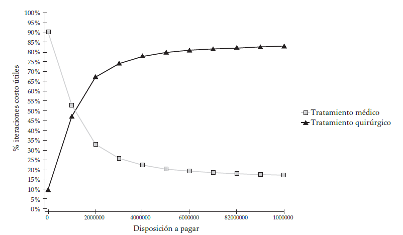 Al introducir diferentes disposiciones a pagar en la curva de aceptabilidad, se observa que en escenarios de gran restricción presupuestaria (menores de COP 1 800 000 en 20 años), el tratamiento médico tiene una mayor probabilidad de ser costo útil. No obstante, a partir de ese valor, y especialmente cuando esa disposición a pagar asciende a COP 5 000 000, la cirugía tiene una mayor probabilidad (80 %) de ser costo útil. Este resultado es similar al encontrado en otro estudio, en el cual dicha probabilidad se aproximó al 90 % (24). Es llamativo que exista un 20 % de iteraciones en la simulación, en las cuales el tratamiento médico siga siendo más costo útil, a pesar de una mayor disponibilidad a pagar.