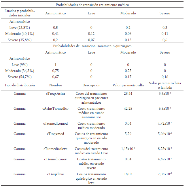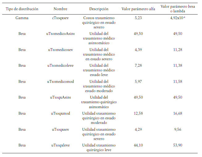 Análisis de incertidumbre: Las evaluaciones económicas reconocen que existe incertidumbre en los datos. Esa incertidumbre podría deberse a la variabilidad entre los pacientes, al valor real de los parámetros del modelo, a la estructura del modelo propiamente dicha o a los lineamientos metodológicos empleados al realizar la evaluación económica. Para analizar la incertidumbre de la variabilidad de los pacientes y el valor real de los parámetros se realizó un análisis de sensibilidad probabilístico de primer y segundo orden usando la técnica de Monte Carlo con 10 000 iteraciones en el software TreeAge Pro. En la simulación de primer orden se generan números aleatorios para seleccionar los pacientes a incluir en el modelo, de tal manera que cada paciente transita en el modelo, y esta acción se repite varias veces, lo que produce una distribución de los valores de las variables. En las simulaciones de segundo orden se representa cada una de las variables, mediante funciones de probabilidad. En cada simulación se asigna una distribución probabilística a cada parámetro del modelo. Para este estudio no se estimó la incertidumbre metodológica ni la estructural del modelo. Las variables sometidas a análisis de sensibilidad fueron los costos totales y las utilidades de los AVAC de cada estado en cada alternativa. Para los costos se utilizó una distribución gama y para las utilidades de los AVAC una distribución beta. Los valores de los parámetros empleados se muestran en la tabla 1.