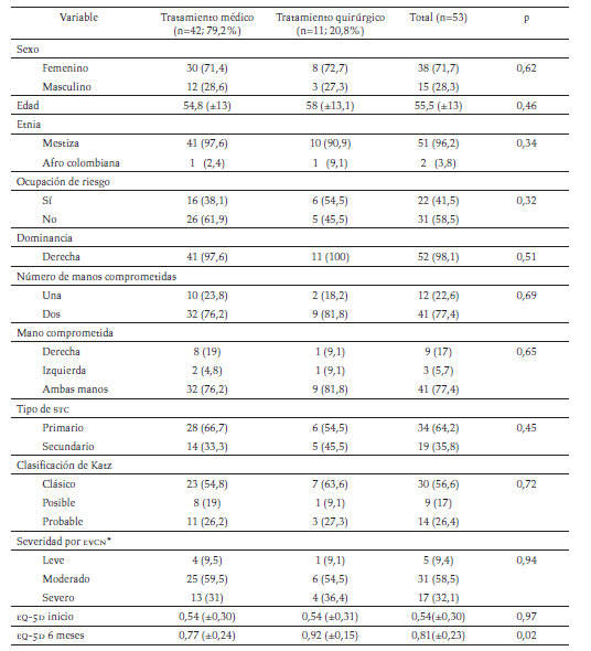 Pacientes y contexto: Se incluyeron 53 pacientes, hombres y mujeres, mayores de 18 años de edad con síntomas clásicos, probables o posibles de STC, según la clasificación de Katz y con evidencia objetiva de alteraciones en los estudios de velocidad de conducción nerviosa, atendidos en el servicio de electrodiagnóstico de un centro hospitalario de alta complejidad en la ciudad de Cali, Colombia, desde agosto de 2012 hasta abril de 2013. A todos los pacientes se les realizó entrevista clínica, examen físico y consulta de historia clínica en caso de ausencia de datos. La etiología del STC podía ser primaria o secundaria. Se excluyeron pacientes menores de 18 años de edad, con síntomas improbables en la escala de Katz y sin alteraciones en los estudios de velocidad de conducción nerviosa. Los pacientes podían estar siendo tratados en servicios de atención primaria o de mayor complejidad, por médico general o especialista.