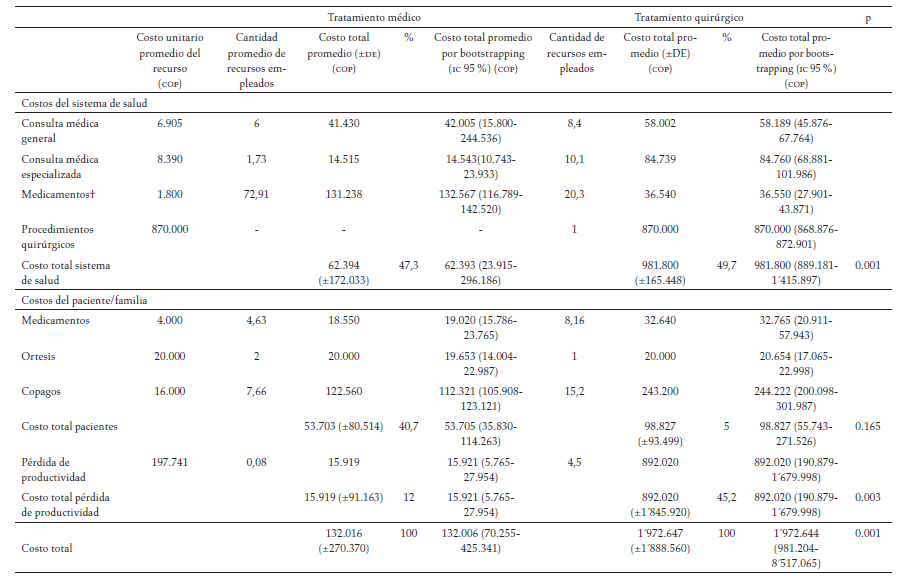 La tabla 3 muestra los costos promedio para cada una de las alternativas. El tratamiento médico tuvo un costo medio a los 6 meses de COP 132 016 y el tratamiento quirúrgico de COP 1 972 647. Los costos del sistema de salud representan el mayor porcentaje en ambas alternativas (tratamiento médico 47,3 % y tratamiento quirúrgico 49,7 %). El único tipo de costos en el que no hubo diferencias estadísticamente significativas fue en los asumidos por el paciente/ familia. Los costos por pérdida de productividad representan un importante rubro en los pacientes sometidos a cirugía, en comparación con los que recibieron tratamiento médico (COP 892 020 frente a COP 15 921). Los demás costos presentaron diferencias estadísticamente significativas en el corto plazo, siendo mayores en pacientes sometidos a tratamiento quirúrgico.
