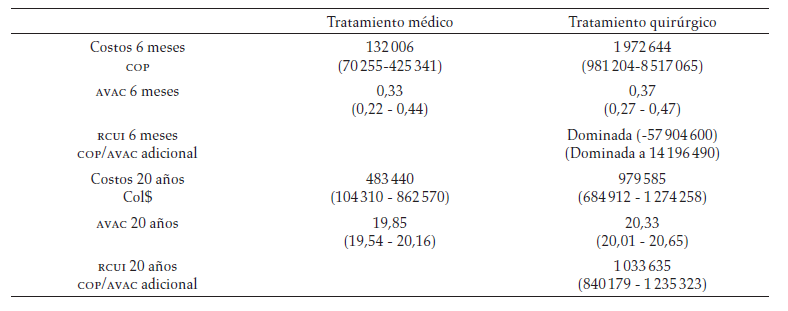 La tabla 4 muestra que el tratamiento quirúrgico es fundamentalmente dominado en su estimación puntual a los 6 meses, aunque el límite superior del intervalo de confianza del 95 % muestra que puede tener una RCUI hasta de COP 14 196 490/AVAC adicional. No obstante, a los 20 años la RCUI entre tratamiento quirúrgico y médico es de COP 1 033 635/AVAC adicional (IC 95 % COP 840 179 - 1 235 323/AVAC adicional).