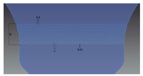 Se diseñó un modelo del sistema basado en microfluidos con el software Autodesk® Inventor, el cual constó, como mínimo, con tres cámaras. La primera de ellas es la cámara de deposición de sangre, en la que se colocará la muestra de sangre a evaluar. A continuación, se procedió a realizar el sistema de filtrado, partiendo del principio de desplazamiento lateral determinístico sugerido por Inglis, Herman y Vesey (8). Este permite la filtración de elementos de diámetro del orden de los micrómetros (μm), según su tamaño en entornos microfluídicos a partir de un ordenamiento característico de cilindros, lo que permite que recorran un camino determinado y se lleve a cabo una selección específica de las estructuras de interés. En este caso en particular, el filtro estuvo compuesto por filas de cilindros ubicados perpendicularmente al paso del fluido, es decir, que el fluido pasa perpendicularmente al área transversal de los cilindros; este grupo de filas de cilindros tuvo un espesor de 10 mm. El espacio entre los cilindros se disminuyó gradualmente en todo su espesor hasta llegar un valor de 10 μm en la última fila, esto debido a que se deseó permitir solamente el paso de los linfocitos (9). Obviamente, el espacio entre los cilindros del filtro se disminuyó al aumentar gradualmente el diámetro de los cilindros desde 300 μm, en la primera fila, hasta 1 mm en la última fila (figura 1). Después de múltiples simulaciones, se decidió que esta cantidad de cilindros y su tamaño eran los más óptimos para la finalidad del filtro.