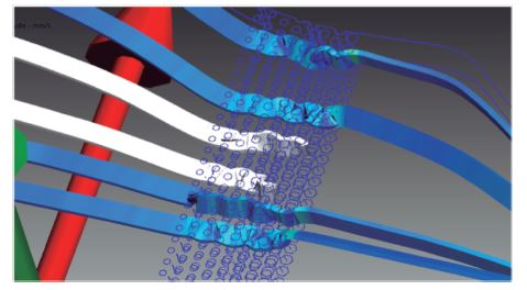 En la figura 2 se observa el comportamiento de las partículas de sangre en el filtro cuando se tiene un diámetro de 5 μm. Se puede observar que las cinco partículas pasan sin ningún problema por el sistema propuesto.
