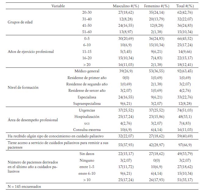 Se encuestaron 145 médicos del HUM, de un total de 650 existentes en el momento de la aplicación de la encuesta, la mayoría de sexo masculino (52 %), entre los 20 y 30 años de edad (42,76 %), con 0 a 5 años de ejercicio profesional (45,52 %). De estos, el 51,03 % se desempeñaban en el área de urgencias, el 40,69 % manifestaron haber recibido algún tipo de entrenamiento en cuidado paliativo, el 66,9 % tuvo acceso a servicios de cuidados paliativo para remitir a sus pacientes y el 35,17 % aceptó haber remitido más de 10 pacientes en el último año a cuidados paliativos (tabla 1).