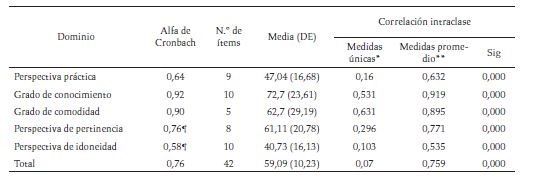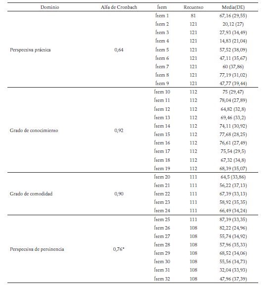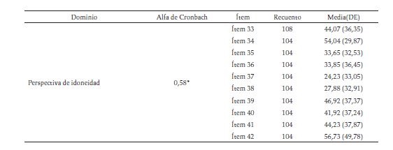 A la evaluación por dominios, los de menor puntaje fueron las Perspectivas de idoneidad (40,73 puntos) y práctica (47,04 puntos) (tabla 3).