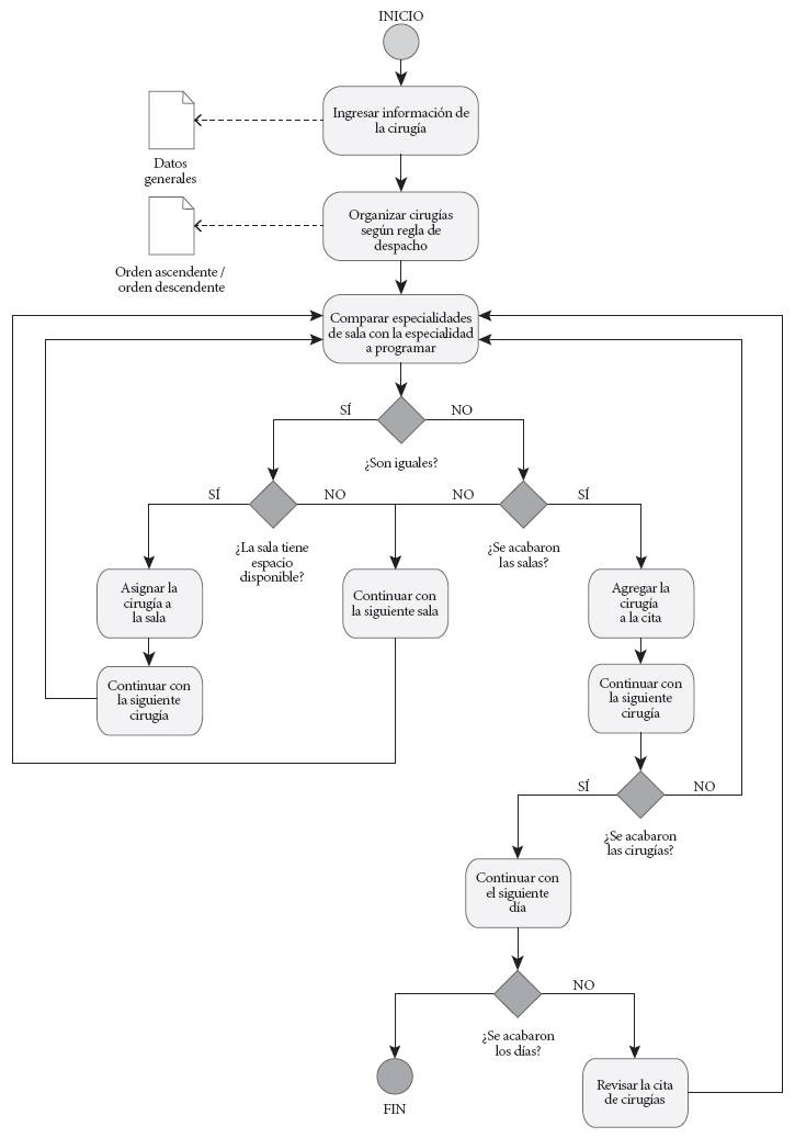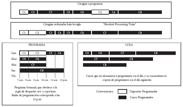 Alternativas para efectuar la programación de cirugías: dado que el objeto principal de la investigación es determinar el impacto de la variabilidad artificial causada por la programación manual, se seleccionó un algoritmo de programación semiautomática heurístico. El objetivo es que la mejora esté explicada por la eliminación de la variabilidad artificial y no por la sofisticación del método. En particular, se probó el algoritmo Bin Packing propuesto por Dexter et al. en combinación con una de dos reglas de despacho: Longest Processing Time (LPT) o Shortest Processing Time (SPT) (21). El Bin-Packing es útil cuando las salas de cirugía tienen características específicas que aplican solo a ciertos tipos o especialidades quirúrgicas. Por su parte, las reglas de despacho han sido seleccionadas por el impacto logrado en estudios anteriores. Por ejemplo, LPT tiene el objetivo de impactar la tasa de ocupación y disminuir el tiempo total del proceso (22); y SPT tiene el objeto de disminuir los tiempos de flujo del proceso (23). La combinación de Bin-Paking y heurísticas básicas ha sido probada exitosamente en trabajos recientes (24, 25).