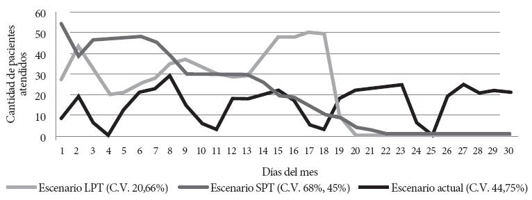 Teniendo en cuenta el comportamiento de los escenarios, con respecto al coeficiente de variación de flujo de pacientes, se logra establecer que el escenario LPT es el que tiene menor variabilidad al disminuir el coeficiente de variación actual en un 25,09%.