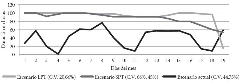 Coeficiente de variabilidad de la ocupación del servicio: para el caso del coeficiente de variación de la ocupación del servicio, se acotó el análisis a los primeros 19 días de programación de los tres escenarios, basándose en los resultados obtenidos en el coeficiente de variación en el flujo de pacientes. Esto se realizó con el fin de comparar el periodo en el que se programa aproximadamente el 98,26% de las cirugías para los escenarios LPT y SPT, lo que evita que la falta de cirugías a programar al final del mes afecte los resultados de los coeficientes de variación (figura 4).
