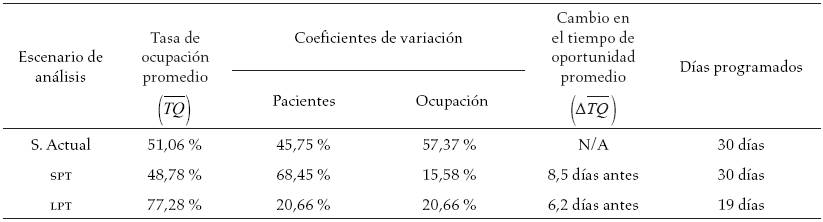 Las programaciones de los tres escenarios fueron comparadas en términos de la tasa de ocupación promedio y los coeficientes de variación diaria para el número de pacientes y la ocupación. Adicionalmente, para los escenarios SPT y LPT se evaluó el cambio en el tiempo de oportunidad por cirugía