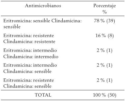 El fenotipo de mayor prevalencia fue el que presentó sensibilidad a eritromicina y clindamicina; sin embargo, es importante señalar que para confirmar la susceptibilidad al grupo, estas cepas deben ser sometidas a caracterización genotípica del transposon Tn554 responsable de la resistencia inducida al complejo MLSB23 (4).